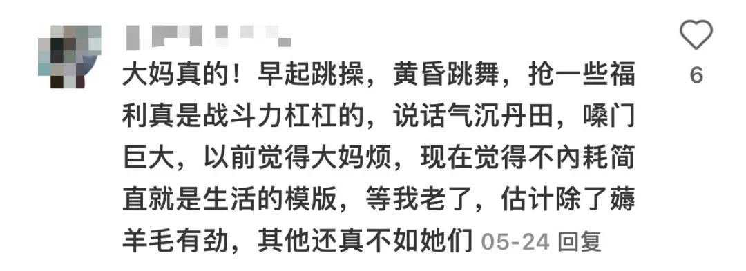 “他们很早就明白了忍受一段时间的‘乳房增生’,退一步‘卵巢囊肿’。所以痞子大妈从来不内耗自己,必要的时候会把别人疯掉,完全不让自己生气。”