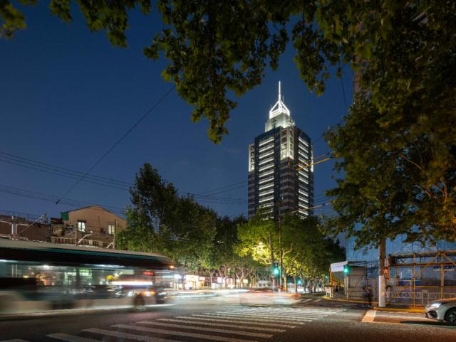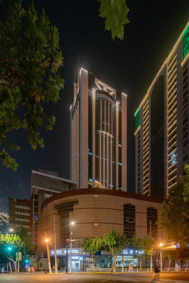 地标建筑在威海路上上海报业大厦高度达 170 米,靠近延安路高架路。当你在延安高架路上行驶时,它会长时间占据视线中心,无论是向西还是向东行驶。照明采用线性照明技术突出建筑主体,使其在被照明时更高。