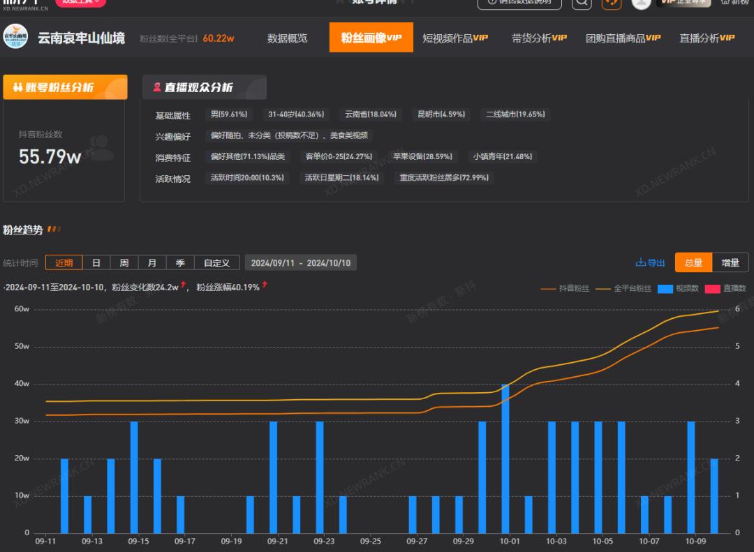 国庆节期间,抖音博主“大壮快逃”在哀牢山进行了12场直播,单场直播的最高观众人数达到227.59万,他还通过直播增加了3.8万粉丝,目前抖音的粉丝人数已达34万。