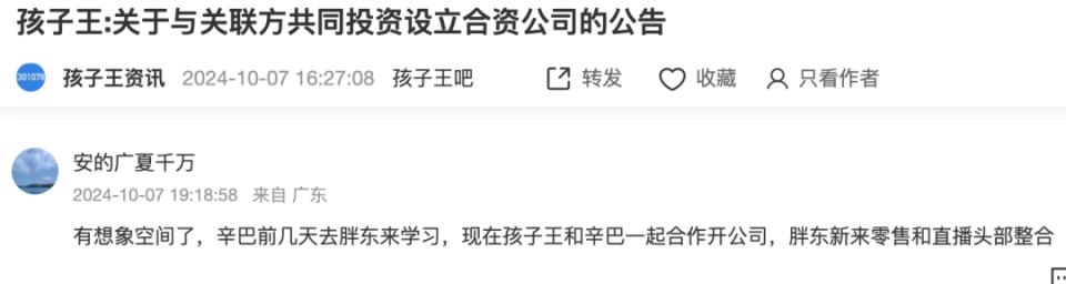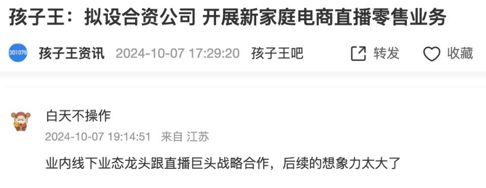 很多投资者在互动平台上说:“有想象力。辛巴前几天去胖东学习。现在孩子王和辛巴一起开公司,胖东来的零售和直播头的整合。”“行业线下业态龙头与直播巨头进行战略合作,后续想象力太大。”