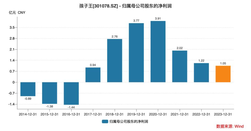 从那以后,孩子王归母净利润一路下滑,与2020年的巅峰时期相比,2023年只有1.05亿元下降了73%。