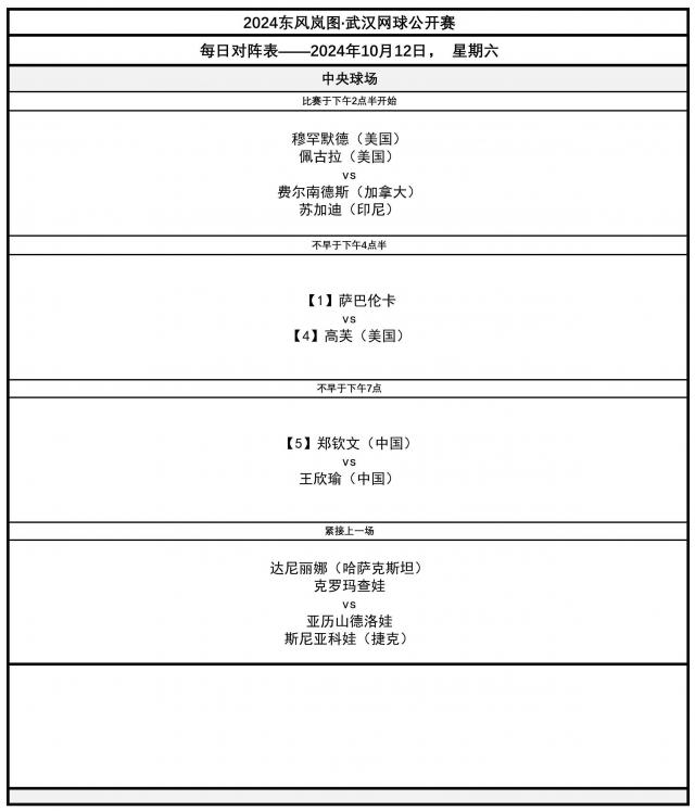 2024 武汉网球公开赛 10 月 12 每天的赛程发布。