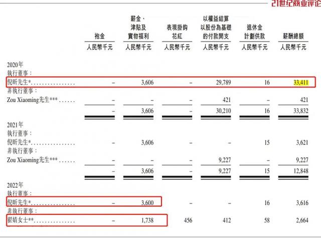 招股书显示,2022 2000年,倪昕的薪酬、津贴和实物福利约定 360 万元。但在 2020 年度,叠加股权,其工资总额高达 3341.1 万元。