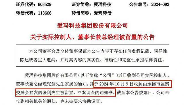 10 月 10 当天晚上,爱玛科技宣布,其实际控制人、董事长张剑,被承德市监察委员会留下,立案调查。