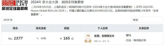 截至 6 月底,张剑有爱玛 68.78% 张格格持有的股权 1.12%。胡润 2024 年度全球富豪榜上,这对父女拥有超过 160 亿元财富。