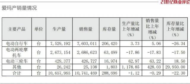 爱玛去年出售 1000 获得电动自行车、三轮车数万辆, 210 一亿元的收入。根据销售计算,该公司是我国电动两轮车的第二名,仅次于雅迪。