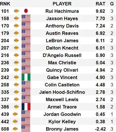 最低的是布朗尼,为 -2.42,他也是湖人队唯一一个数据为负的球员。