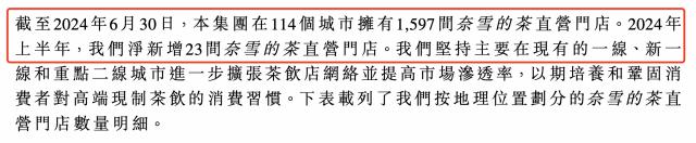 截至 2024 年 6 月 30 日,奈雪在 114 城市共有 1597 上半年增加了一家直营店。 23 家。去年 7 月亮,奈雪放开加盟,截至今年, 6 月 30 日,奈雪共有 297 家庭加盟店面。