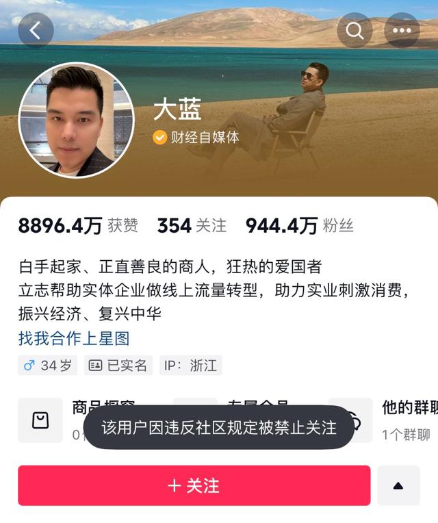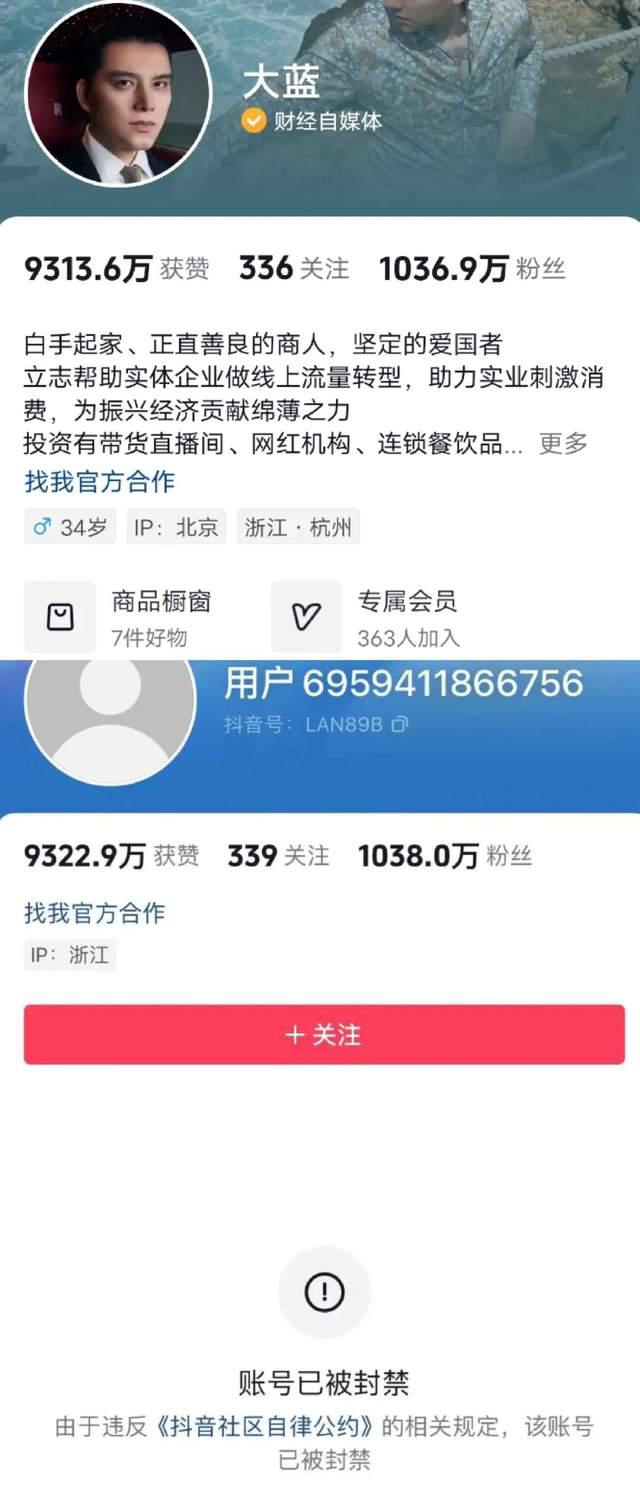 现在,大蓝的抖音帐号主页显示:由于违反了《抖音社区自律公约》的有关规定,该帐号已经被封禁。