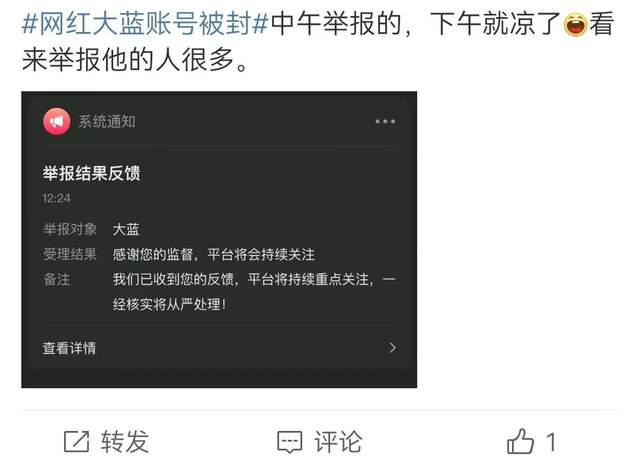 至于大蓝账号被封,有网友说:中午举报,下午就凉了。似乎有很多人举报他。这位网友似乎把大蓝账号被封的原因归咎于网友的举报,但为什么大蓝会被举报呢?