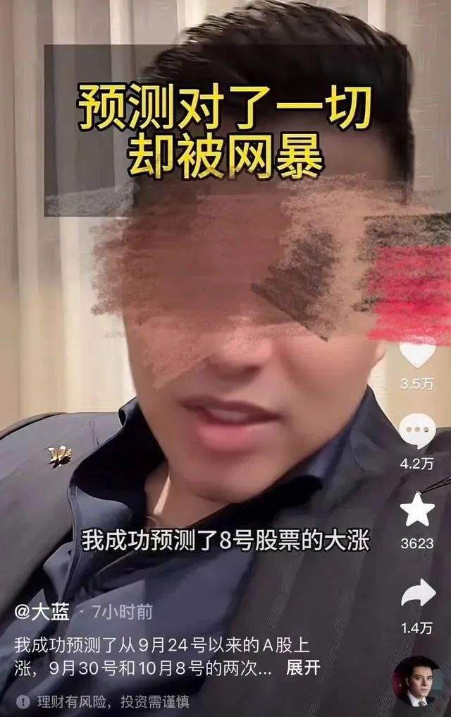 为此,大蓝感到非常委屈,也感到非常委屈。十 月 9 日本,大蓝发布了一段视频,说预测对了一切,但被网络暴力攻击。他还说,他发视频只是不想让粉丝错过牛市。然而,一些别有用心的人煽动了亏损的投资者的情绪,将差异对准了自己。