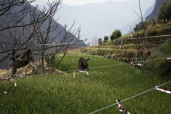 两个农民在麦田里系上绳索,系上彩色布带或闪亮塑料带,希望能部分缓解鸟类的入侵。