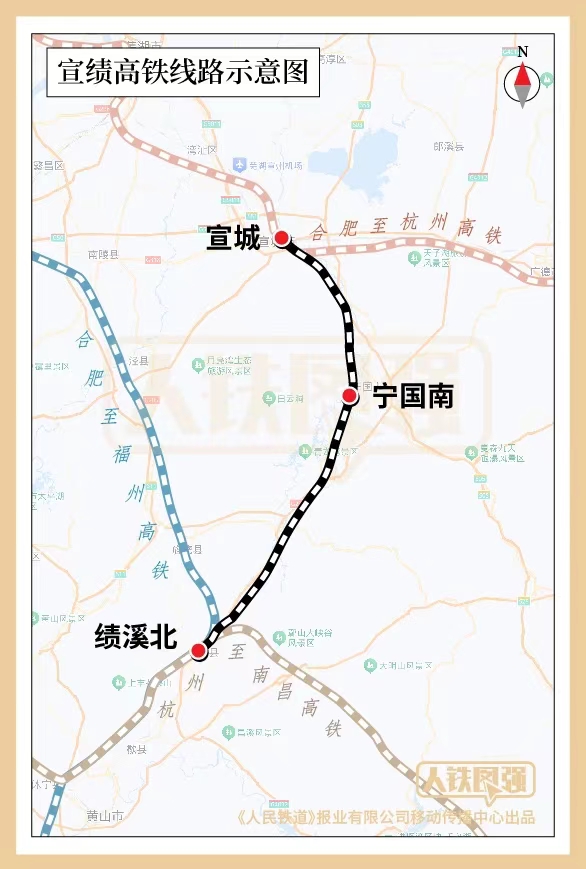 10月11日9时许,首次启动列车G9298次,从宁国南站驶往宣城站,12时52分左右到达列车终点上海虹桥站,意味着宣绩高铁正式开通运营。宣绩高铁位于安徽省宣城市,总长115公里,设计时速350公里。宣城、宁国南、绩溪北三个车站全线设置,其中宁国南站为新车站。