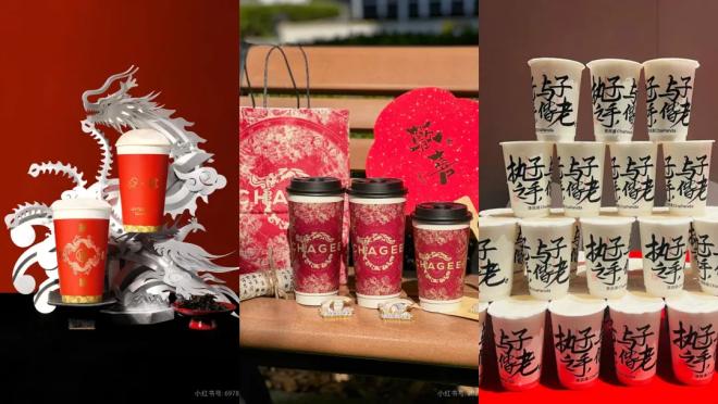 比如西茶联合品牌CLOT的红纸杯,霸王茶姬的聚友小红杯,“牵着你的手,和你的儿子一起变老”的书法杯,都有自己的快乐和美好的含义,特别适合婚姻场景。