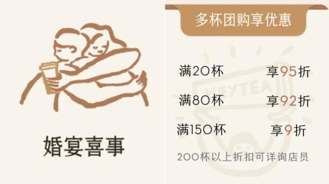 以喜茶团餐优惠为例,20杯以上订单享受95折、80杯以上92折、150杯以上9折。