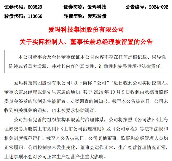 十月十日,爱玛科技发布公告,通知实际控制人张剑家属,张剑先生被留下并立案调查。