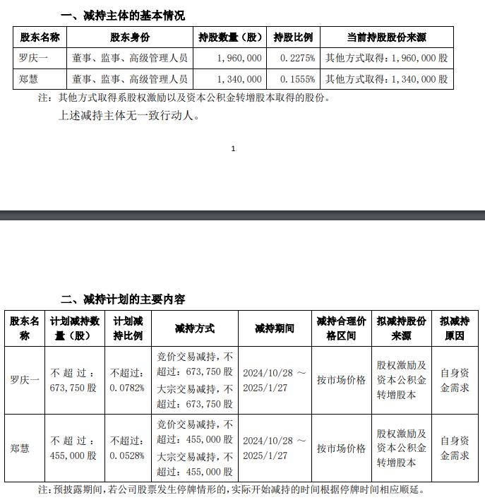 到9月28日,爱玛科技副总经理罗庆一和财务总监郑慧将在第二份减持公告中存在,他们都将减持他们所有的股份: