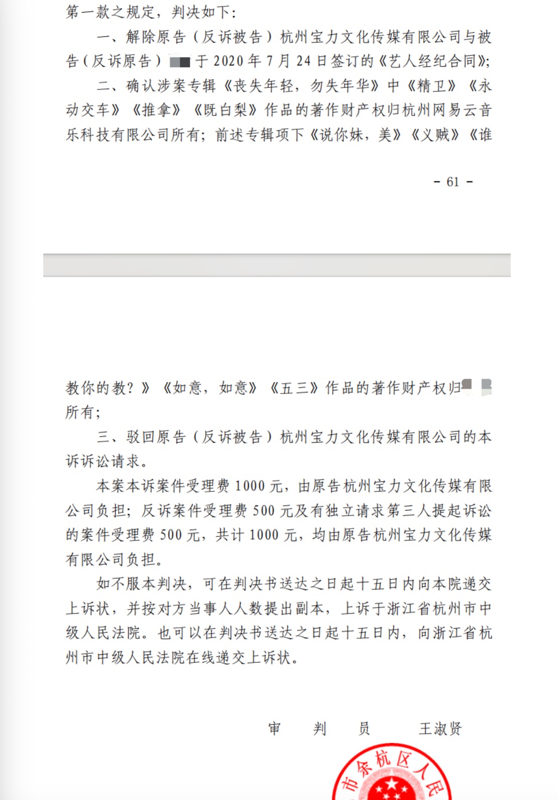 法院判决:杭州宝力文化传媒有限公司和被告(反诉原告)普某于原告(反诉被告) 《艺人经纪合同》于2020年7月24日签署;确定杭州网易云音乐科技有限公司所有涉案专辑《失去青春,不要失去青春》、《精卫》、《永动交车》、《按摩》、《白梨》作品的作品财产权;上述专辑《说你妹妹,美丽》、《义贼》、《谁教你的》?》《如意,如意》和《五三》作品的产权归普某所有;驳回杭州宝力文化传媒有限公司原告(反诉被告)的诉讼请求。