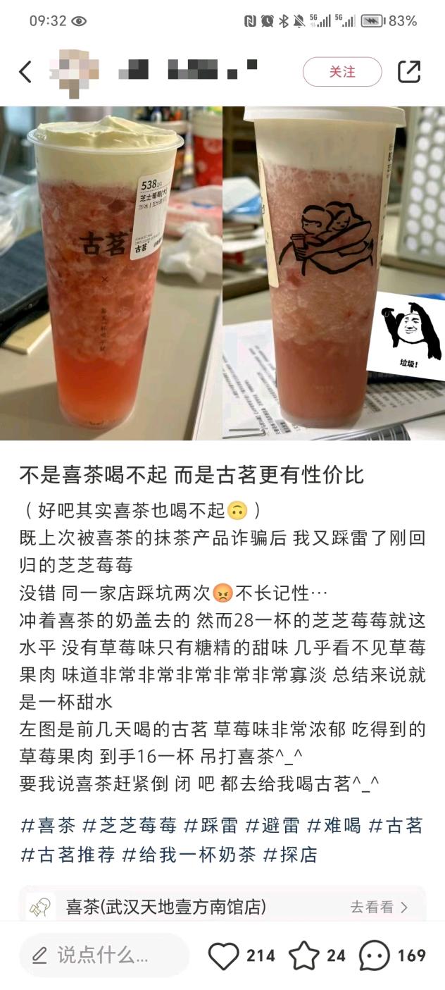 “不是你买不起茶,而是古茶更划算...喜茶28杯的芝麻莓没有草莓味,只有糖精的甜味几乎看不到草莓,而古茶的草莓味道很浓郁。你可以得到16杯草莓果肉,你可以享受喜茶。”