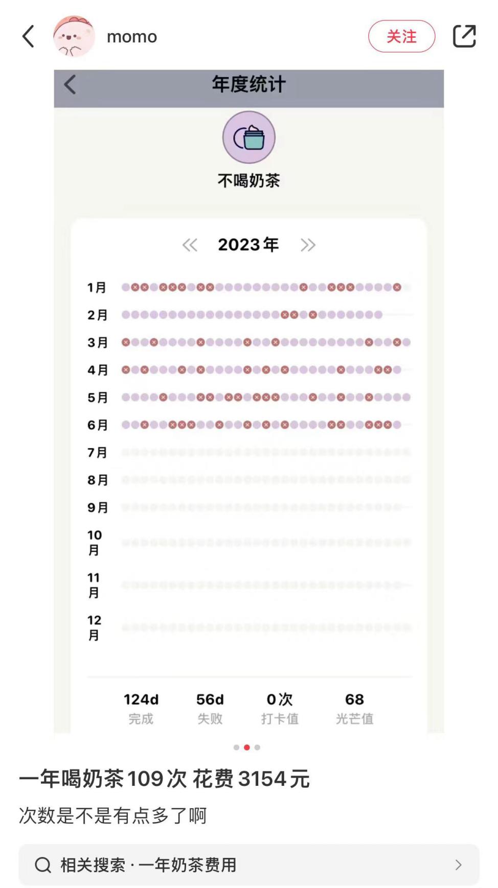 有小红书网友表示,每年喝109次奶茶,花费3154元。平均每次价值28元。还有人估计,“平均每周三杯,平均每杯25元左右,一年要花4000多元喝奶茶。”
