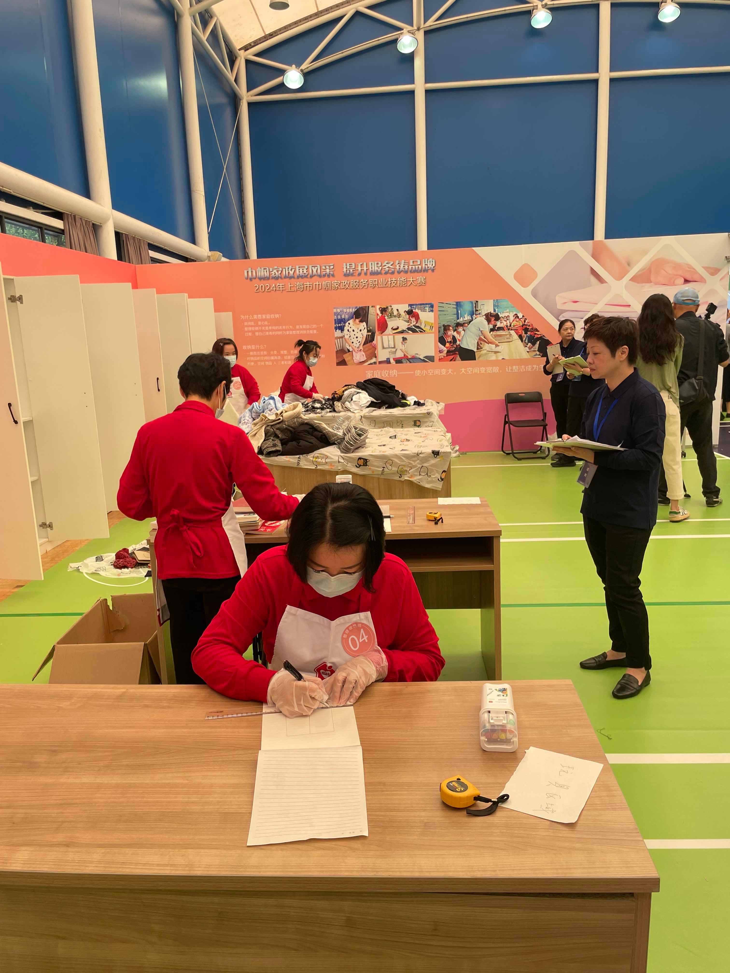 比赛现场有四个比赛项目:养老护理员、母婴护理员、家务服务员和收纳师,以及两种职业风格展示项目:家政培训师和家政经理。