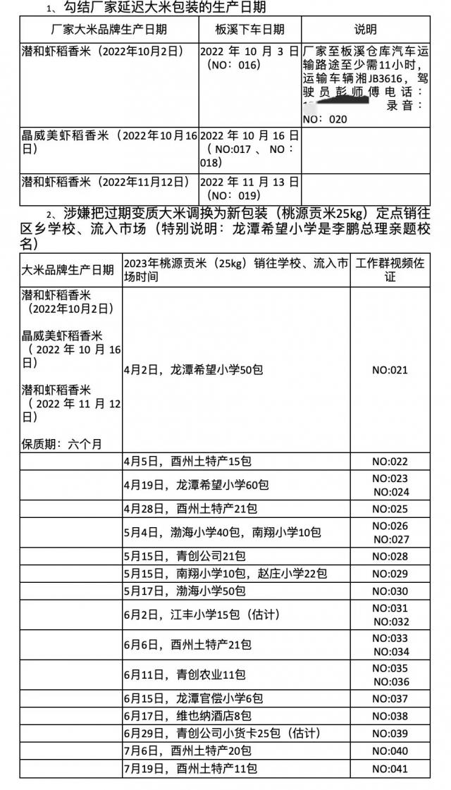 2022年,根据举报人提供的材料。 年 10 月和 11 每月生产的潜和虾米和晶威虾米 2023 年 4 月到 7 月份流向龙潭希望小学、渤海小学、南翔小学、龙潭官偿小学、江丰小学等多个单位,共约。 416 包,10.4 吨。