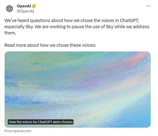 在长文中, " 寡姐 " 透露 openAI 曾邀请她为公司提供新的聊天机器人。 ChatGPT-4 配声,在她拒绝之后, OpenAI 发出一种与她的声音非常相似的声音,以致于她的声音 " 最亲密的朋友和媒体无法区分区别。 " 。