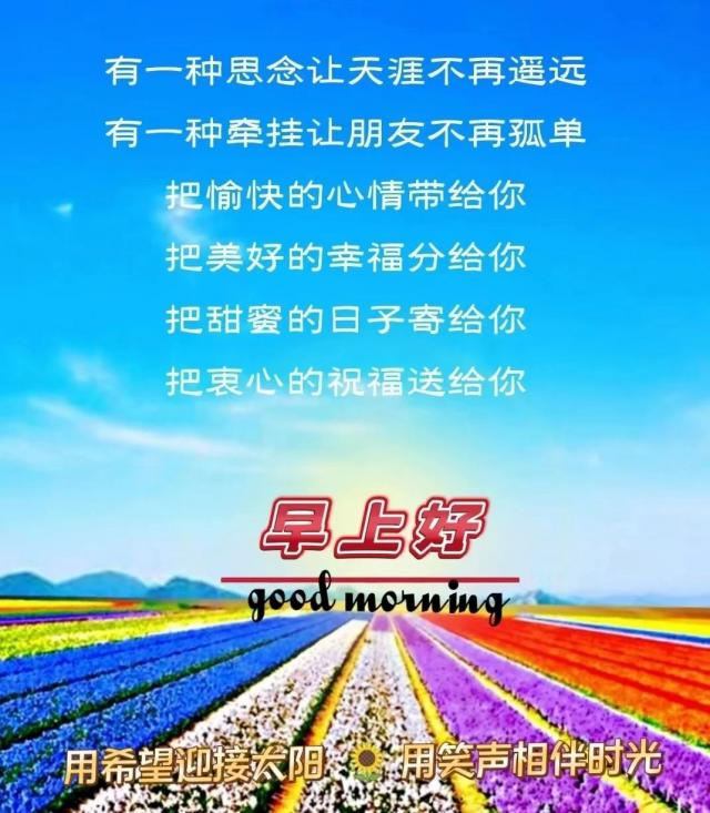 清晨的第一缕阳光是我给你的问候。祝你每天心情愉快,健康快乐!愿我们一起享受这幸福的生活,一起创造美好的未来!
