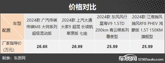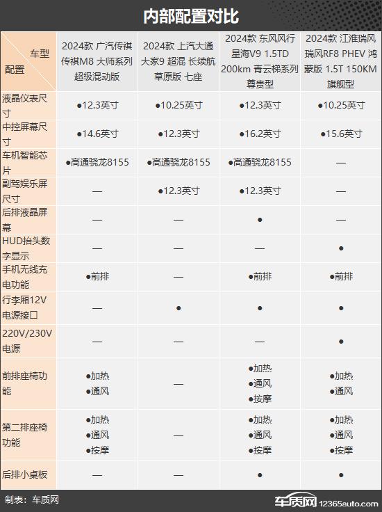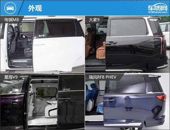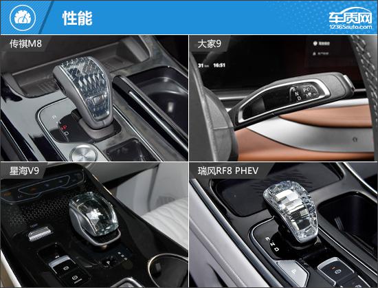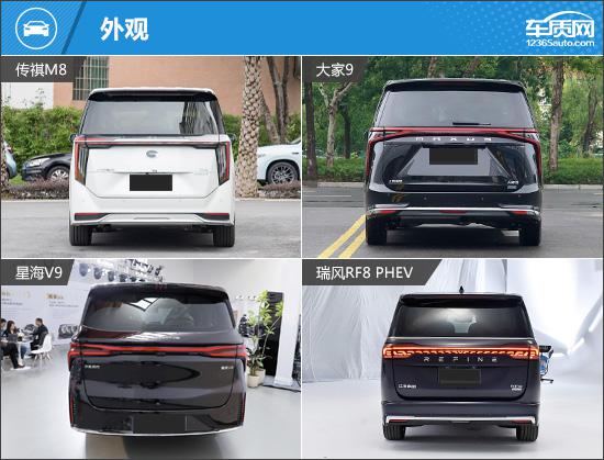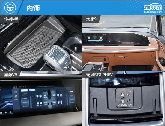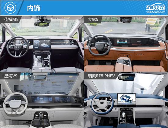 内部部分,大家 9 和星海 V9 全部采用三联屏设计,科技氛围塑造极佳。传祺 M8 和瑞风 RF8 PHEV 然后采用主流的悬浮式中控面板,车内比较简单,整体观感也不错。