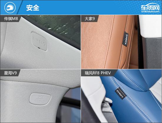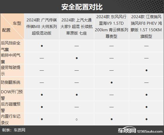 在安全性方面,传祺 M8 整体表现要更出色一些,拥有相对丰富的主人。 / 被动安全配置,甚至配备非常罕见的后挡风玻璃安全气囊,可以有效提高第三排乘客的安全性。相比之下,每个人 9 和星海 V9 在一定程度上缺乏安全配置。