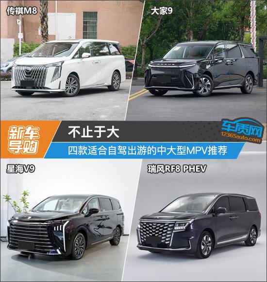 下面我们就为大家挑选四款特别适合自驾游的中大型中大型游戏。 MPV,分别是广汽传祺传祺 M8(以下简称:传祺 M8)、上汽大通大家 9 超级混合(以下简称: 9)、东风风行星海 V9(以下简称:星海 V9)和江淮瑞风瑞风 RF8 PHEV(以下简称:瑞风 RF8 PHEV)。四款 MPV 车型均为自有品牌,且均采用混合动力系统,具有优异的油耗和综合续航性能。其中,传祺 M8 以广汽为基础的全新换代车型 GPMA-L 平台架构的构建,内外都有很大的变化; 9 是在 2024 年 6 每月正式上市,不但保留了大家 9 一贯优势,还采用插电式混合动力,提高了燃油经济性;星海 V9 是东风风行旗下全新的中大型中大型中大型。 MPV,其搭载 1.5T 发动机和电动机的组合,CLTC 纯电续航里程最高可达 200km;瑞风 RF8 PHEV 是基于江准 MUSE 首款量产车型架构,选用插电式混合动力系统,WLTC 综合油耗低至 1.27L/100km。四款车都有不同的风格和亮点,相信一定不会让你失望。