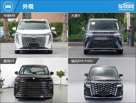 在外观上,四款车都采用了各自的家族式设计语言,其中传祺 M8、星海 V9 以及瑞风 RF8 PHEV 全部采用“大嘴”式进气格栅,尤其是星海。 V9,前格栅尺寸非常夸张,视觉冲击力强。每个人都有。 9 然后采用了目前纯电动汽车常用的封闭式前格栅设计,整个前脸非常简洁,更具时尚气息。