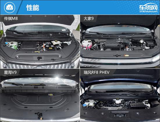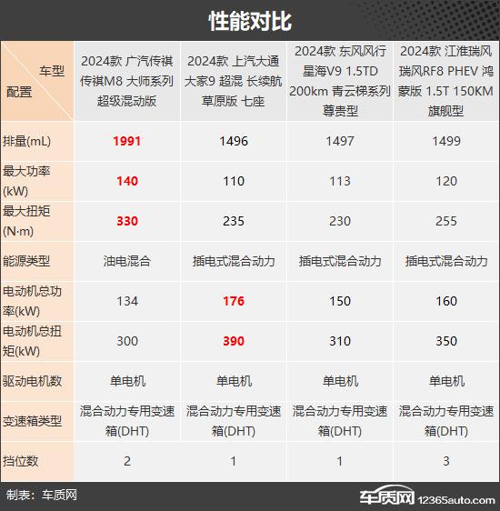 动力装置方面,四款车均采用混合动力系统。其中,传祺 M8 这是本次比较中唯一的搭载。 2.0T 发动机型号,发动机参数最亮,其它三款车型的发动机参数相差不大。关于电动机,大家 9 性能最好,电动机总功率为 电动机总扭距达到176kW 390N · m。相比之下,因为传祺 M8 这是一款油电混合型号,所以电机参数略逊一筹,总功率只有一点。 134kW,不过好在发动机性能不错,动力方面不用担心。