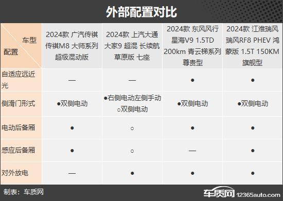 星海在外部配置上 V9 和瑞风 RF8 PHEV 性能最好,不仅配备自适应远近光,还配备两侧电动侧滑门和对外放电功能,可有效提高日常车辆的便利性。相比之下,每个人 9 只有右边的电动侧滑门配置,甚至没有配置电动后备箱,外部配置表现比较寒酸。