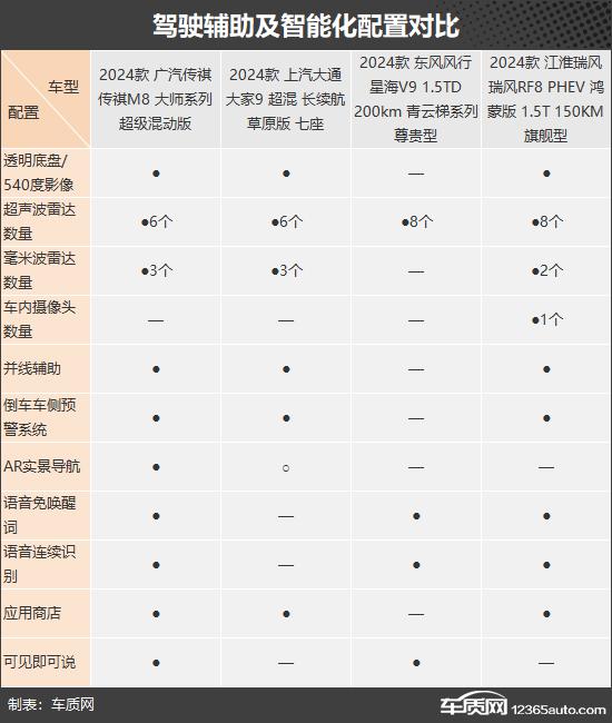 驾驶员辅助方面,传祺 M8、大家 9 以及瑞风 RF8 PHEV 全部配有透明底盘 /540 程度图像、并线辅助、倒车车侧预警系统等。,拥有丰富的驾驶辅助设备。相比之下,星海 V9 这是唯一一款没有配备上述功能的车型,驾驶辅助功能有些欠缺。