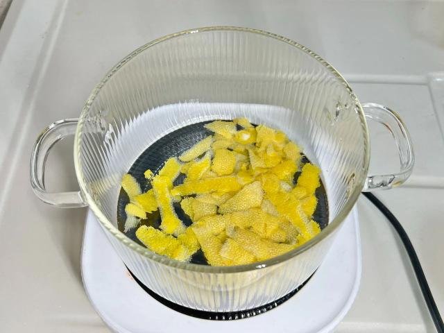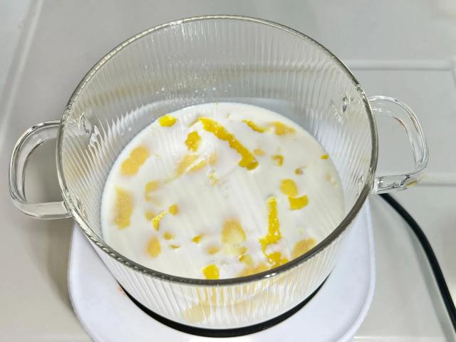 1.2 一个柠檬去皮,锅里加 190 煮好的mL牛奶,煮开后关掉盖子焖,备用;
