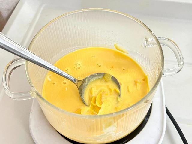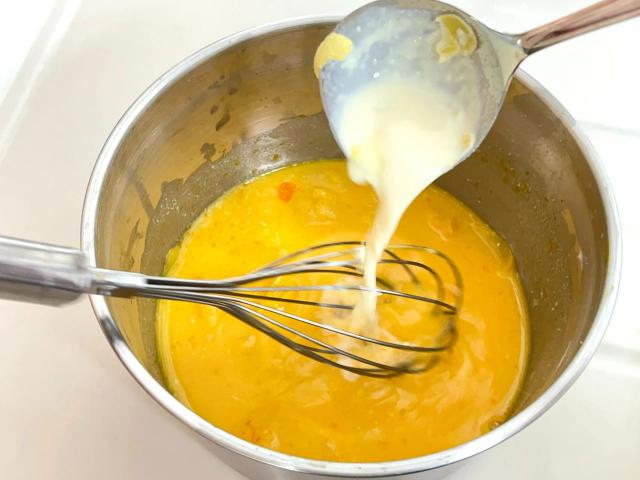 4. 柠檬奶再一次加热到边缘微沸,加入少量多餐的蛋黄糊搅拌均匀;