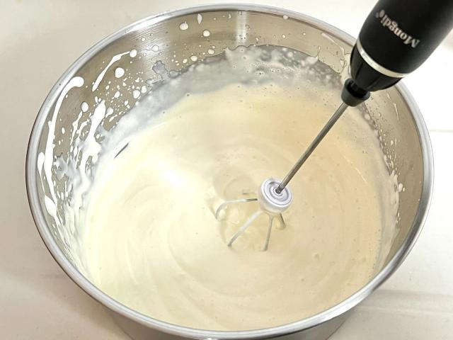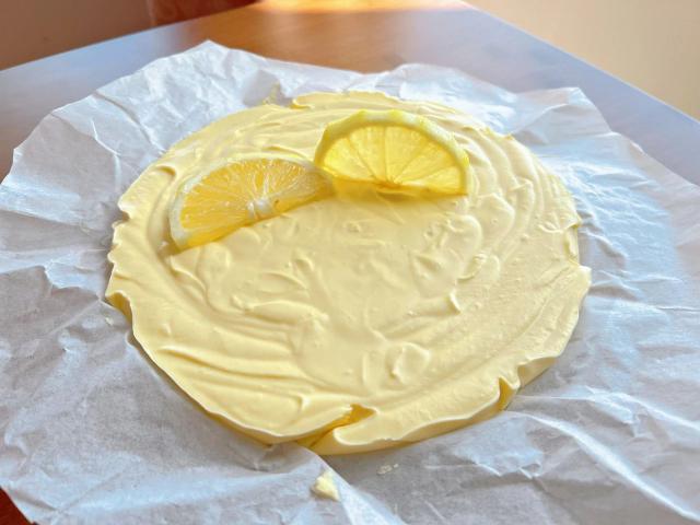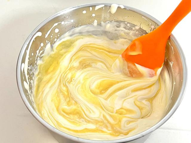 7.230 将克淡奶油打发成粘稠的酸奶状,与冷却后的柠檬奶酱混合均匀;