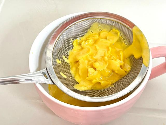 6. 过滤柠檬片,加入泡软的吉利丁搅拌均匀;