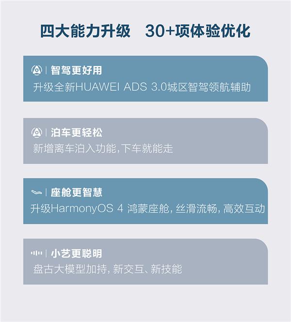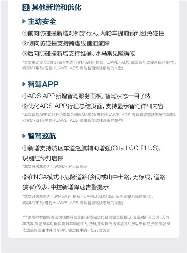 最大的升级项目是全新的 HUAWEI ADS 3.0 在城市智能驾驶领航辅助下,可以升级端到端的网络架构,了解复杂的交通场景,预测行人和车辆的行为,实现更多人类的智能驾驶。