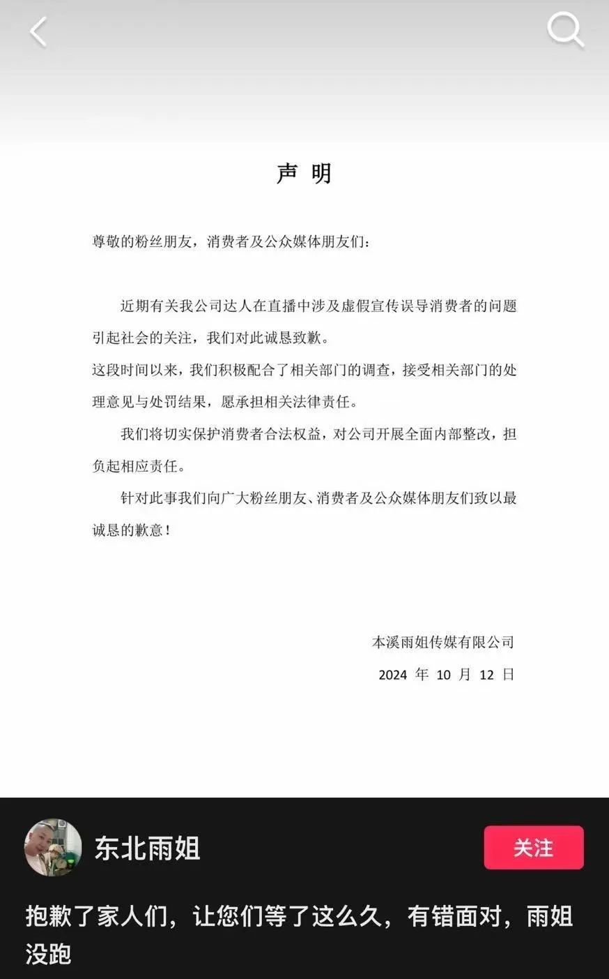 10月12日晚,“东北雨姐”通过社交媒体账号发表声明称:“对不起,家人,让你等了这么久。如果你犯了错误,雨姐没有跑。”