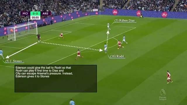 从进球过程来看,这似乎是一次完美的进攻,从斯通斯长传到布丁组合的连接,看起来非常简洁流畅。然而,这个进球却让瓜迪奥拉很不满意,他在短暂的庆祝之后,把埃德森叫到场边一顿猛烈的批评。依据曼城跟队记者 Sam Lee 对此,瓜帅认为埃德森应该把球传给他前面的罗德里或京多安,这样他们就能把球传给他,成功地打破阿森纳的高位。但是埃德森选择了传给接近底线的斯通斯,后者最终只能无奈起大脚。这种情况明显违背了瓜迪奥拉的传控战略理念。因此,即使进球,西班牙人也非常不满意。