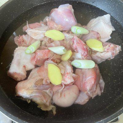 1、鸡肉切块洗净冷水下锅,加入姜片,小葱焯水