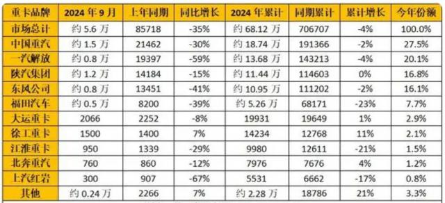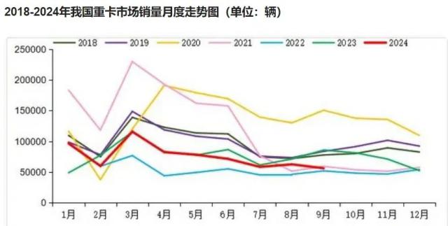 从9月份的销售数据可以看出重卡行业的艰辛。数据显示,2024 年 9 月份,我国重卡市场销售合同 5.6 万台(包括出口和新能源在内的批发规格)环比下降 10%,同比下滑更高达10% 35%。