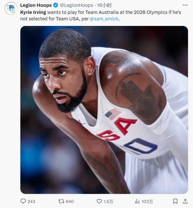 多次为美国男篮出战世界大赛,欧文也可以为澳大利亚出战。 2028 年度奥运会?这次接受吗? Sam Amick 欧文在采访中直言不讳地说:我很乐意为澳大利亚效力,但是我认为概率不大,这取决于奥委会的做法。“欧文说得不全对,实际上取决于美国篮协和国际篮联。