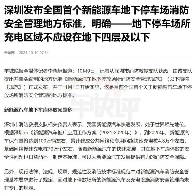 面对这种情况,深圳最近发布了《新能源汽车地下停车场消防安全检查标准》,这是中国第一个。在规范中,除了提高火灾防范观念和应对策略外,最重要的是明确规定新能源汽车地下停车场的充电区域不应设置在地下四层及以下。
