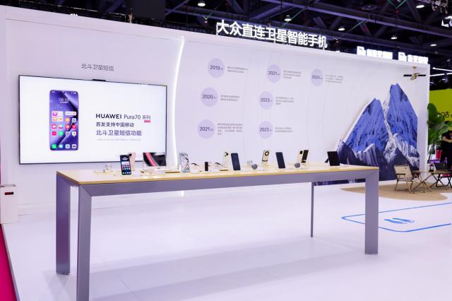 华为终端北斗卫星区,华为 Pura 70 该系列凭借其在中国推出的移动北斗卫星短信功能,成为展区备受关注的明星产品。客户只需要简单地完成移动运营服务的配置,即使他们在没有移动数据网络和 WLAN 覆盖偏远地区,也可以轻松使用北斗卫星短信实现远程通信。