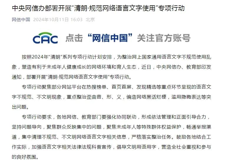 近日,中央网络信息办公室、教育部发布通知,部署开展“清晰规范网络语言文字使用”专项整治。专项整治侧重于热搜榜单、首页首屏、发现优化等一些网站平台所呈现的语言文字不合规、不文明现象。,重点整治歪曲的声音、形状和意义,编造网络黑话烂梗,滥用晦涩难懂的表达等突出问题。