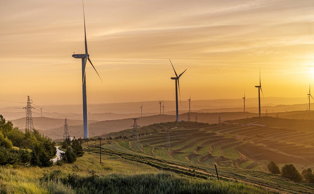 甘肃省定西市通渭县,华家岭梯田层层,风力发电机组于2024年7月26日矗立在山头。视觉中国 图