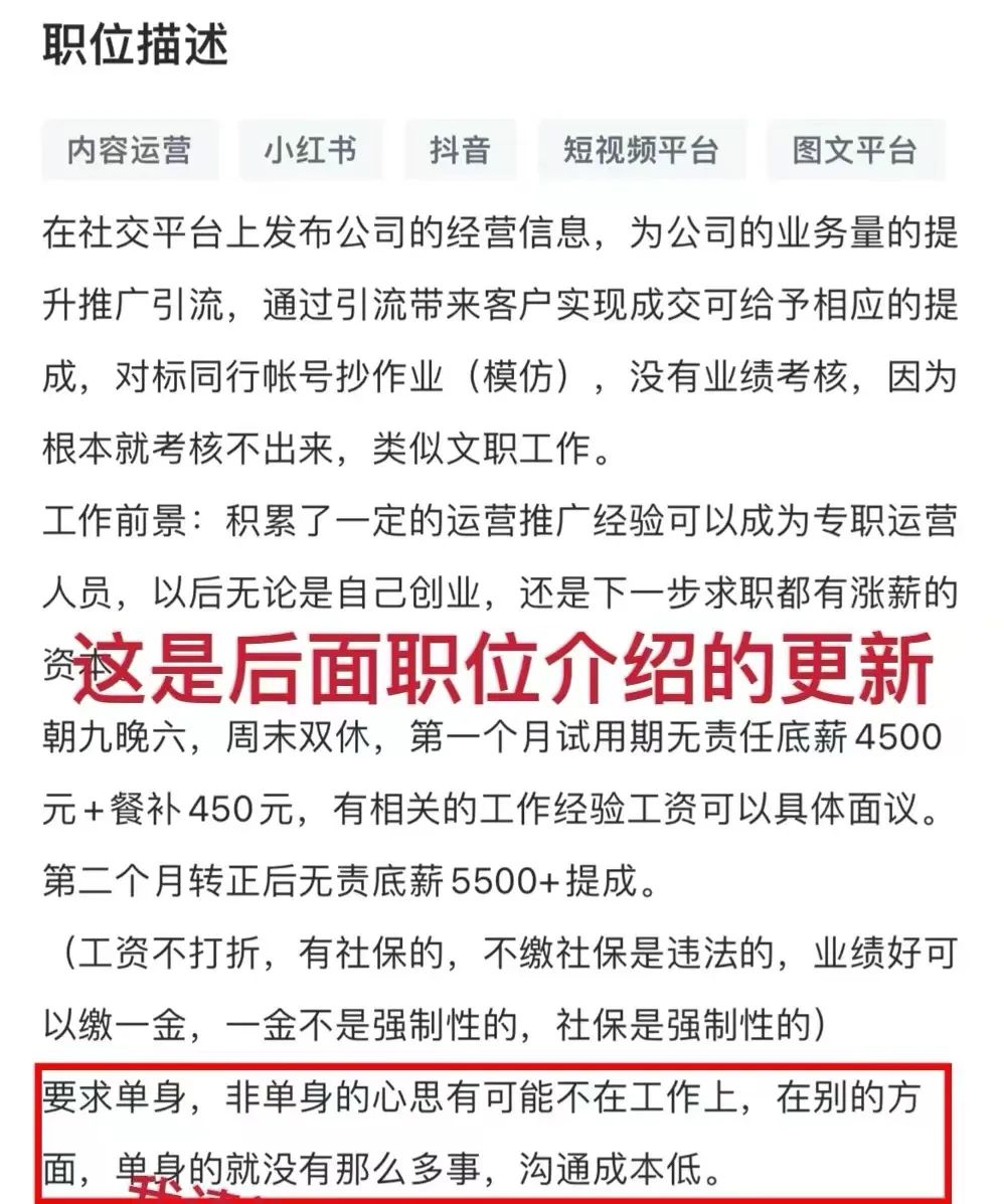 9日,段女士在智联招聘中浏览了“新媒体运营助手”的岗位信息,发现招聘信息更加“详细”,并增加了“要求单身,非单身的想法可能不在工作中。在其他方面,单身的人没有那么多事情,沟通成本低。”